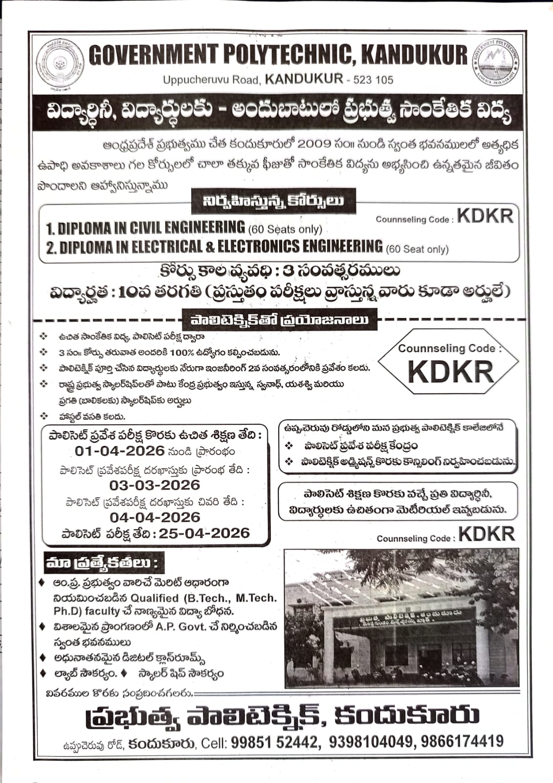 Government Polytechnic, Kandukur.Beside: TRR Degree and Junior Colleges, Uppucheruvu Road, Kandukur, SPSR Nellore District,Andhra Pradesh - 523 105.Phone: 08598 222245Email: gptkdkr@gmail.com